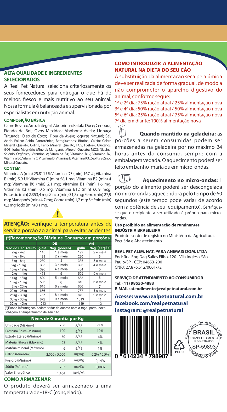 Carne bovina – Arroz Integral – Abobrinha – Batata Doce – Cenoura – Fígado de boi – Ovos Mexidos – Abóbora – Aveia – Linhaça triturada – Óleo de coco – Fibra de aveia – Iorgute natural – Sal